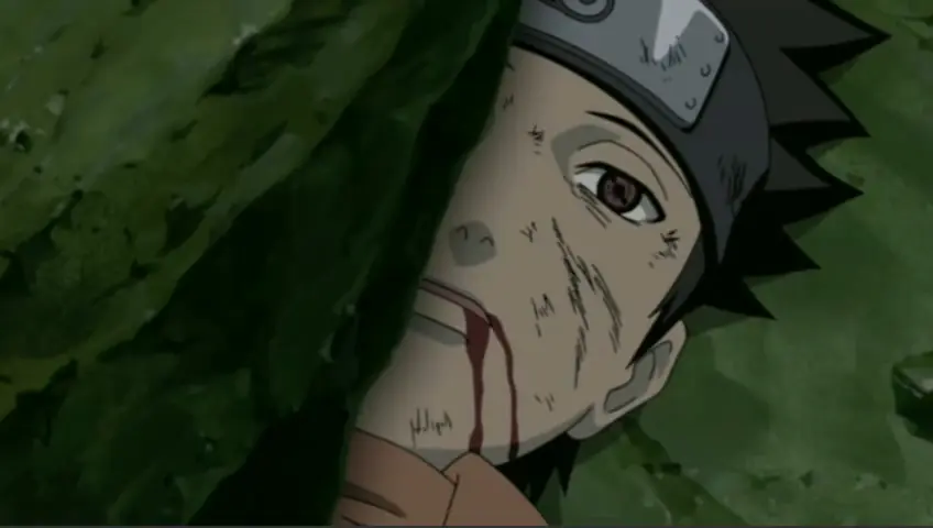 Obito muriendo tras ser aplastado por una roca.