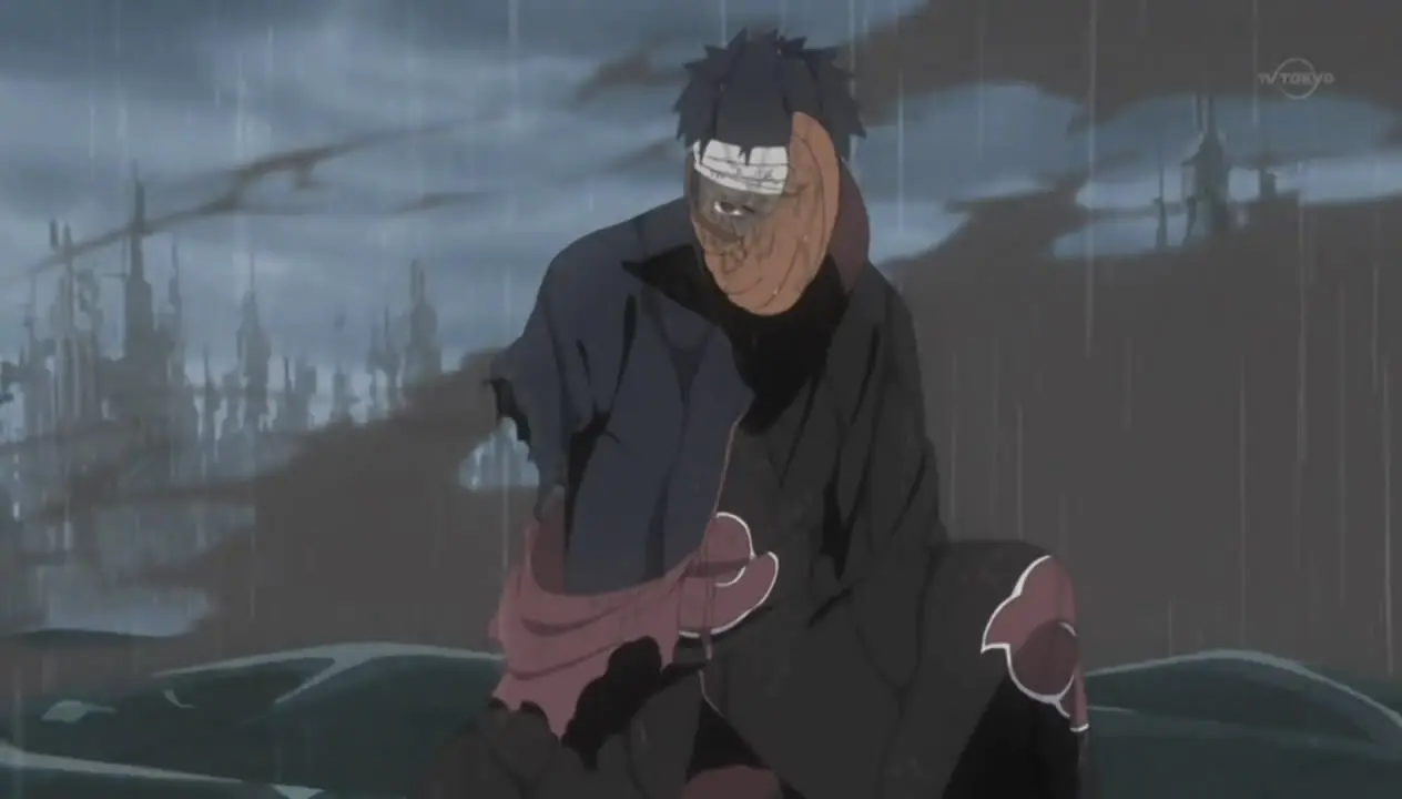 Tobi se presenta en Amegakure totalmente confiado, y confronta a Konan para poder conseguir el Rinnegan. Después de que esta se niega a revelarle el lugar donde se encuentra el doujutsu, Tobi pregunta si valía la pena traicionarle por Naruto Uzumaki, a lo que Konan responde que éste es la luz personificada, la flor de la esperanza. Después de esto, como último tributo a Konan, le confiesa que el ayudó a Yahiko a crear Akatsuki y que fue él quien le otorgó el Rinnengan a Nagato. Konan queda consternada, pero esto lo que hace es decirle más, por lo que rodea a Tobi de papeles, y éste, al intentar absorberla, se da cuenta de que mezclados con los papeles van sellos explosivos.