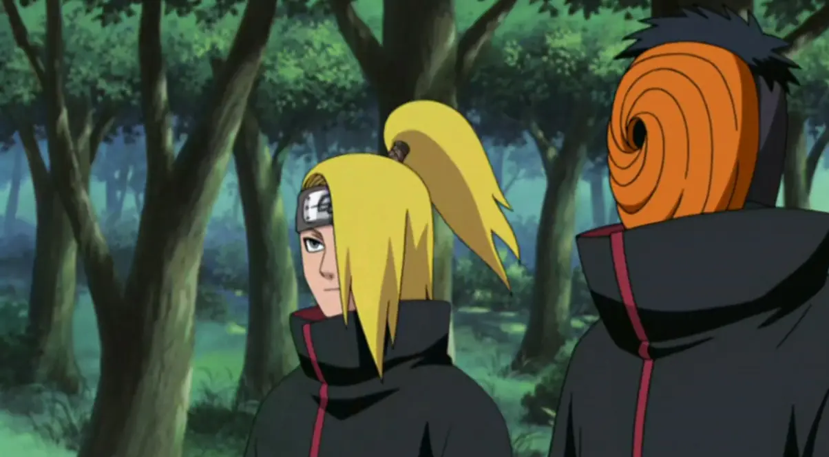 Tras la derrota de Orochimaru a manos de Sasuke, su hermano mayor Itachi se perfila como su siguiente objetivo y su equipo Hebi, así pues Akatsuki se pone en estado de alerta, Deidara y Tobi logran encontrar a Sasuke antes que nadie y entablan batalla con él. En un primer momento se esconde de él por el miedo que le provocó la mirada de Sasuke al comparar su parecido con el de Itachi y al comenzar un combate recibe una estocada del Chokuto de Sasuke gracias a su Sunshin jutsu, no obstante el extraño Akatsuki se levanta indemne. Deidara toma la iniciativa del combate con su C1 pero Sasuke logra volver su estrategia contra él y hacerlo retroceder.