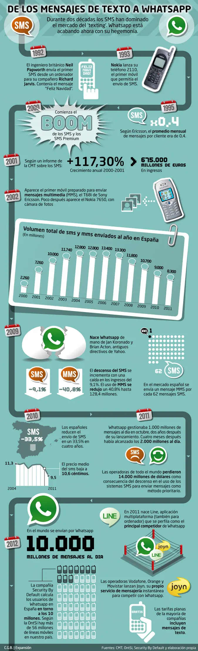 Y mientras los sistemas de envío de mensajes usando Whatsapp, Line y demás sistemas semejantes continúa creciendo constantemente, los SMS no dejan de caer en picado. Podemos ver en esta infografía, publicada por expansion.com, como las operadoras en todo el mundo han perdido (dejado de ganar) más de 14.000 millones de dólares por el abandono del SMS.