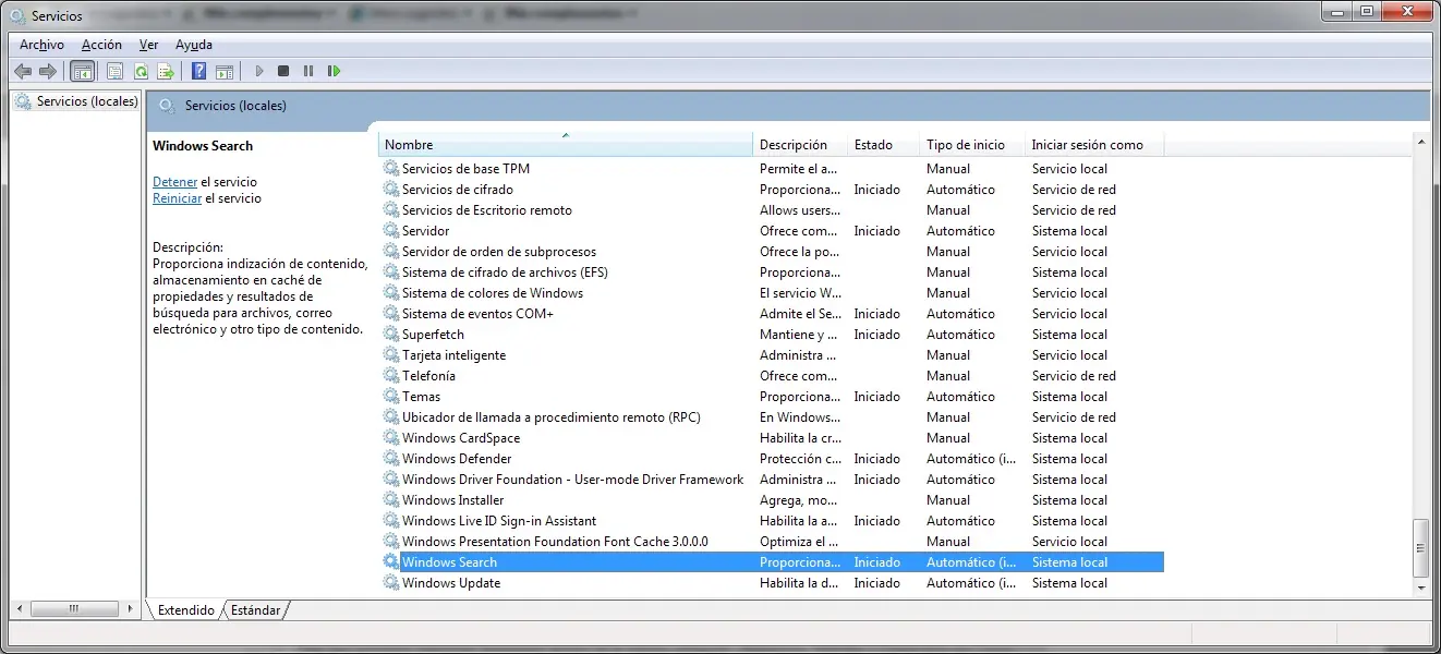 Windows 7 utiliza el índice de búsquedas para encontrar de forma más rápida ficheros en nuestro disco duro. Si tenemos todos nuestros archivos organizados no nos hará falta y si lo desactivamos podremos ahorrar recursos del sistema. Para conseguirlo haremos clic en Inicio y escribiremos servicios seguido de Enter. Luego encontraremos el servicio Windows Search pulsaremos con el botón derecho y elegiremos la opción Detener.