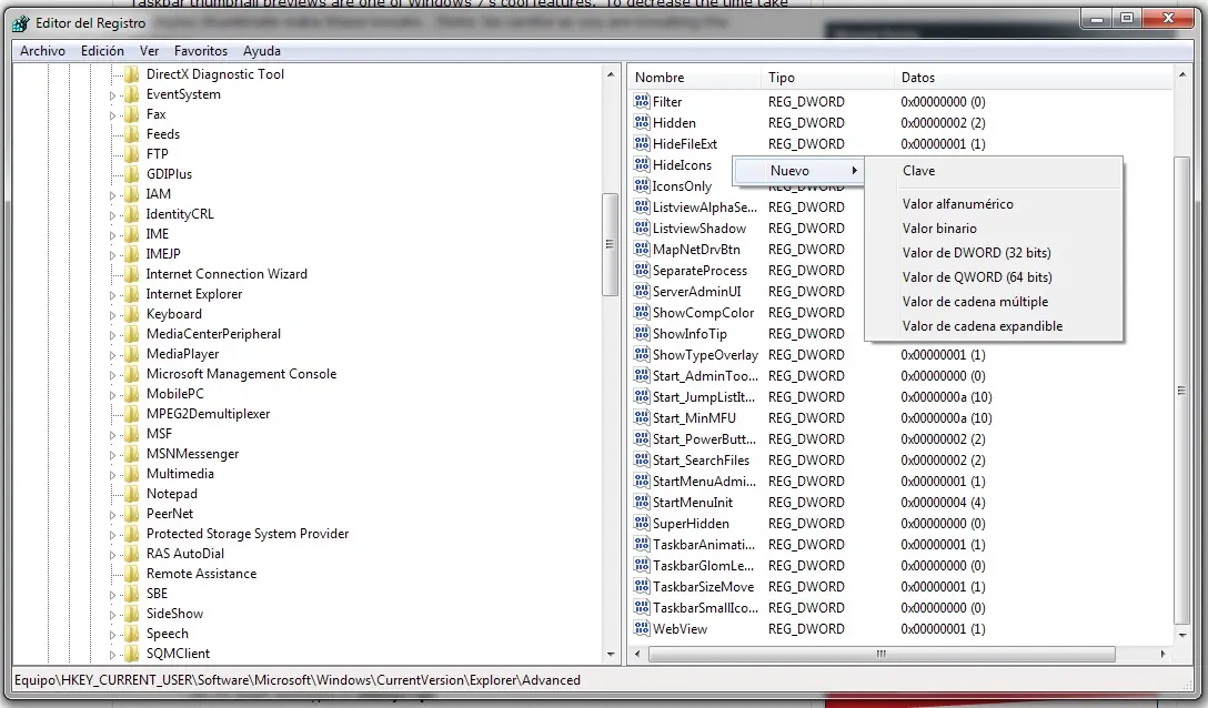 Quizás la característica más famosa de Windows 7 es la nueva barra de tareas. La previsualización de las ventanas en miniatura es espectacular y además podemos acelerarla. Abrir el menú Inicio y luego ejecutar regedit. Abrir la entrada HKEY_CURRENT_USER/Software/Microsoft/Windows/CurrentVersion/Explorer/Advanced y haremos clic con el botón derecho sobre una zona libre de la carpeta y elegiremos Nuevo y a continuación Valor de DWORD.