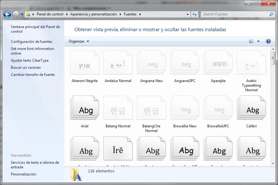 Al mostrar las fuentes en pantalla, Windows consume bastantes recursos para activar el suavizado y mejora de la definición de las mismas. Si queremos que el sistemma funcione más rápido, lo mejor es tener instaladas solamente las fuentes que necesitemos y que utilicemos más habitualmente. Para desactivar fuentes abiremos Panel de control y luego usaremos el buscador para encontrar el apartado Fuentes. Una vez abierto marcaremos y moveremos a otra carpeta las fuentes que no usemos normalmente. Para volver a instalarlas simplemente haremos el proceso contrario.