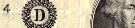 El sello negro con la letra grande en el centro significa el banco de la Reserva Federal que colocó la orden para producir el billete. A = Boston, B = Nueva York, Filadelfia = C, D = Cleveland, E = Richmond, Va., F = Atlanta, G = Chicago, H = St. Louis, I = Minneapolis, J = Kansas City, K = Dallas.