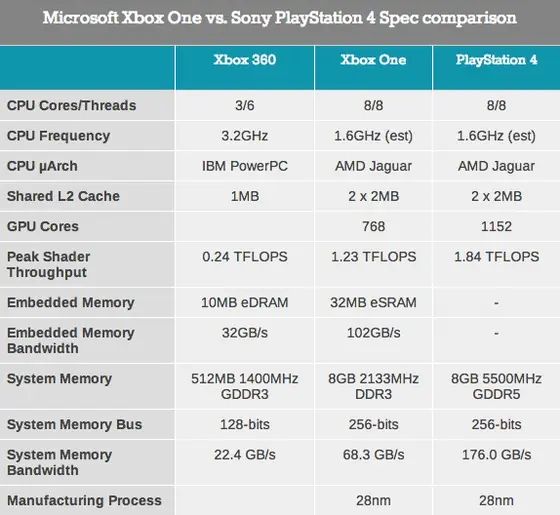 Según los rumores, Microsoft habría optado por una configuración distinta para su GPU, la cual solo contaría con 12 Compute Units (Cus) con un total de 768 Shaders, mientras que la gráfica a elección de Sony contaría con 18 CUs con un total de 1152 SPs, lo que le dotaría a la PlayStation 4 de una ventaja gráfica de un 50%.