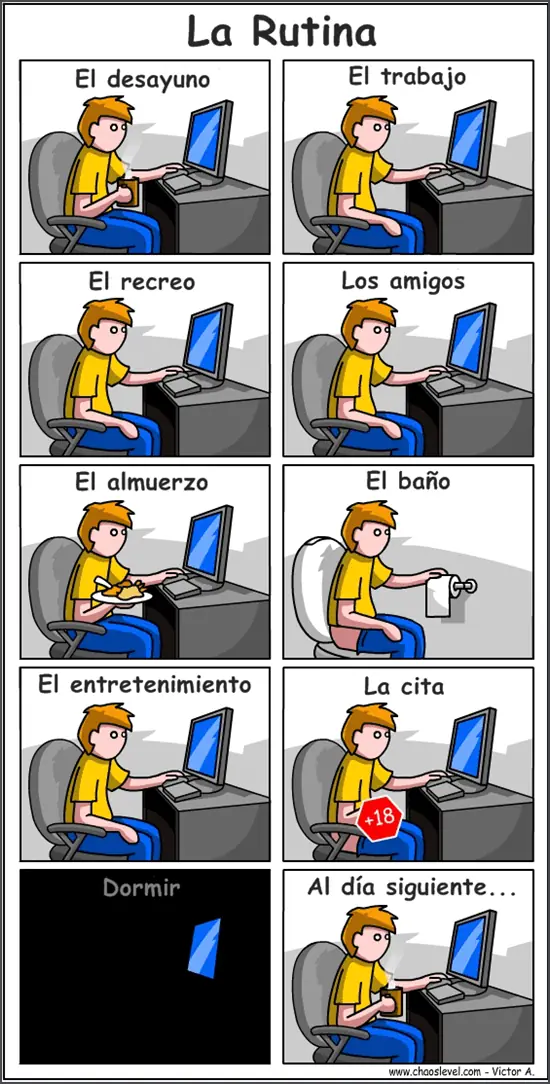 En este muy cómico gráfico podemos ver la rutina diaria de un adicto al internet, resumida en 10 simples pasos. En ellos se encuentra la pura verdad, y deja en claro lo que mencionábamos antes.