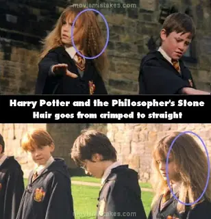 Después de que Harry sea seleccionado para Gryffindor y termine la ceremonia de selección, empieza el banquete. En la primera imágen vemos a Harry sentado al lado de Ron y enfrente de Hermione y en la siguiente escena aparece al lado de Percy y Hermione y enfrente de Ron.