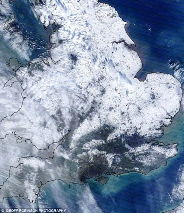 En esta primera imagen que fue tomada el sábado, muestra la mayor parte del Reino Unido, cubierto de una espesa capa de nieve, que ha causado estragos en las carreteras y dejaron muchas escuelas cerraron la semana pasada.