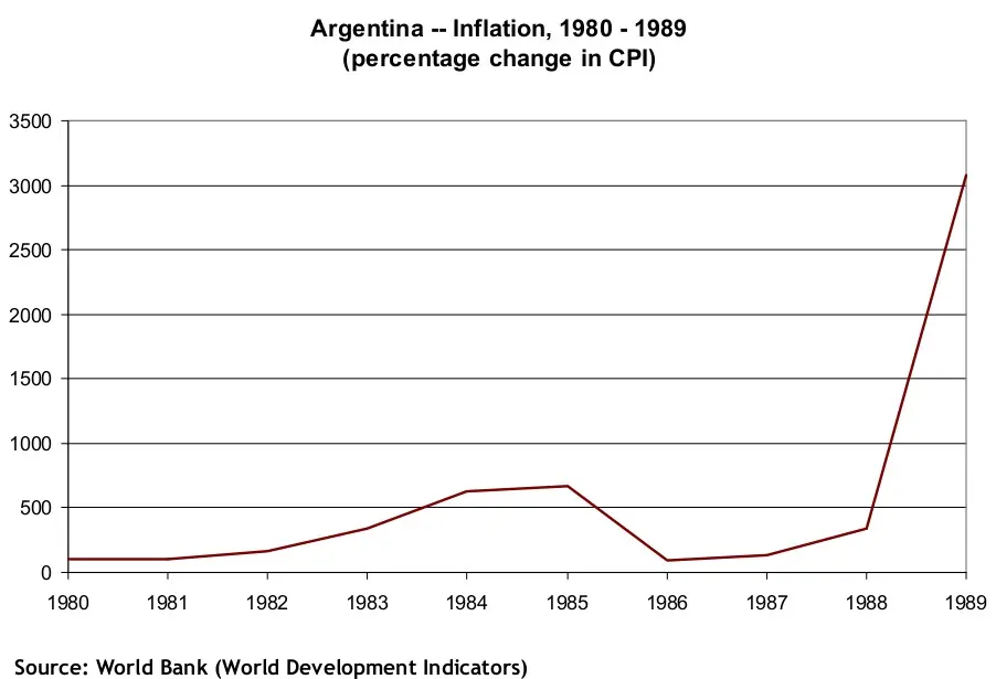 Tras la reinstauración de la democracia (1983), la crisis se agudizó hasta tal punto en la década de los 80 -con hiperinflación de por medio- que el peronista Carlos Menem (1989-1999) intentó revertir la política económica mediante la privatización de empresas estatales (como YPF), cierta apertura comercial al exterior y la fijación del peso argentino al dólar estadounidense para frenar la inflación.