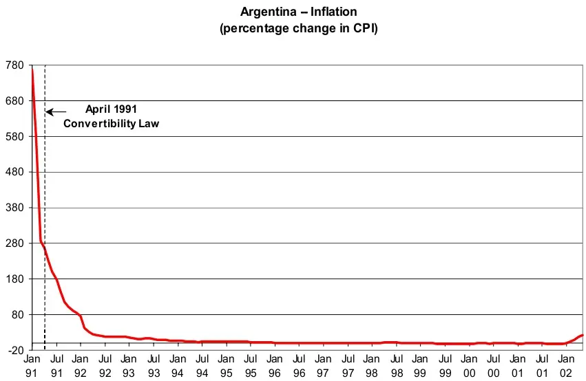 Puesto que la fijación al dólar ataba de pies y manos a su banco central para imprimir dinero y generar inflación (reduciendo así el peso de la deuda externa), Argentina decidió de forma unilateral declararse en default (impago) en 2001, lo cual generó una corrida bancaria y el temido corralito de 2002.