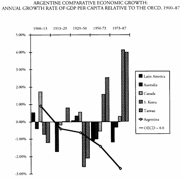Como resultado, el desarrollo argentino fue mucho más lento y débil que el del resto de países avanzados durante la segunda mitad del siglo XX. En esencia, se mantuvo un gasto público elevado; un sustancial control estatal sobre la economía (nacionalización de industrias); el modelo de sustitución de importaciones y, por tanto, el aislacionismo comercial; la emisión desenfrenada de dinero (alta inflación); y un adoctrinamiento cultural (en escuelas y universidades) centrado en el nacionalismo, que fomentaba el mercantilismo y el odio hacia el extranjero (incluido el capital foráneo). Y todo ello, en medio de una gran inestabilidad política.