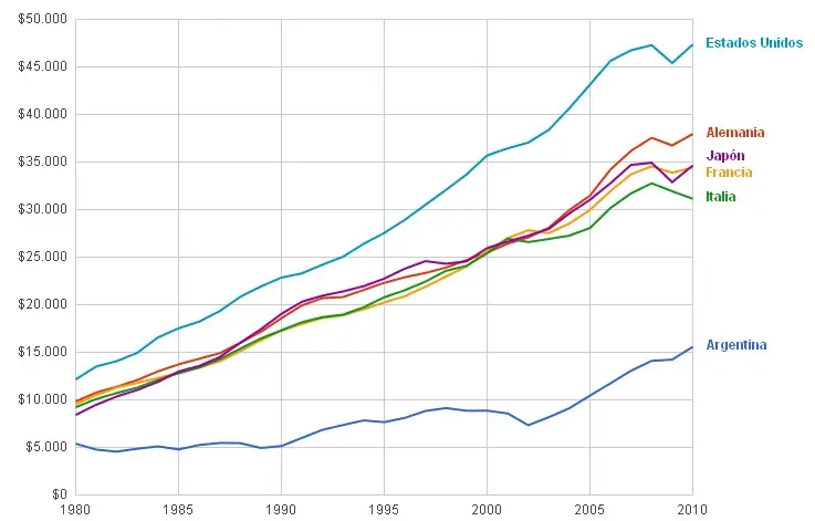 Hace ahora un siglo, Argentina se encuadraba en el top ten de países más ricos del mundo. Hoy se sitúa en el puesto 59 del mundo, según los últimos datos del Fondo Monetario Internacional (FMI), a la altura de México, Líbano o Gabón, y muy próximo a Venezuela (puesto 64). Según el Banco Mundial, su renta per cápita, en términos de poder de compra (descontando inflación), apenas superaba los 15.500 dólares en 2010, un 70% menos que EEUU, un 60% inferior a Japón o Alemania y la mitad que Francia o Italia.