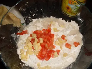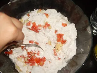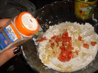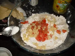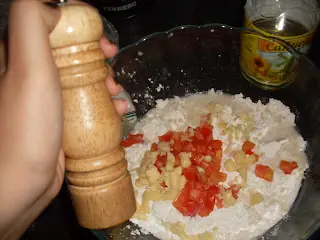 -Lo mandamos de una al bowl y agregamos:25 grs. de manteca por cada dos tazas de harina,una taza de agua tibia,sal y pimienta a gusto y media cucharadita de azucar.
