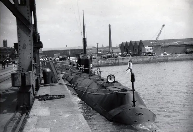 Submarino "Seraph" siendo aprovisionado para el viaje, en el puerto de Preston