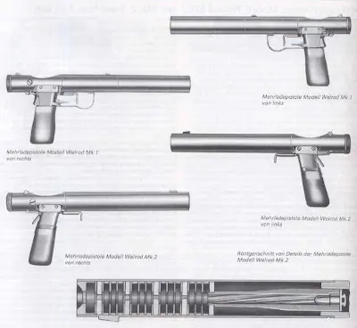 A este tipo de pistolas con supresor incorporado se les denomina de “asesinato silencioso” básicamente por que es para lo único que se utilizaban. Poseían cargador para 8 proyectiles, pero eran de una cadencia de tiro muy lenta, eran de repetición, esto es se efectuaba el disparo y había que volver a recargar la recamara manualmente ya que para evitar los ruidos no se cargaba automáticamente, y debían utilizarse a muy corta distancia del objetivo, a 3 metros como máximo. Esta pistola Welrod es un modelo de fabricación británica, diseñada y desarrollada por la “estación 9”, una sección del SOE británico encargada de desarrollar armas y equipo y distribuirlo a los movimientos de resistencia de la Europa ocupada.