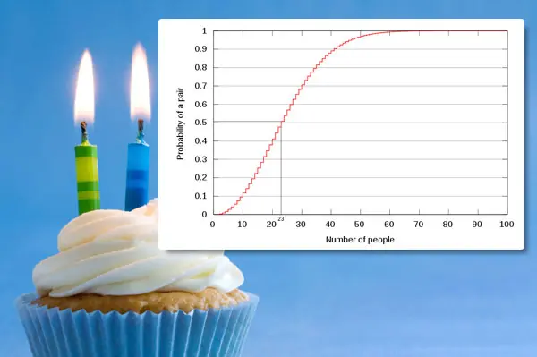 Se dice que en un cumpleaños con 23 personas, existe una probabilidad de más del 50% de que al menos dos personas cumplan años el mismo día. De hecho, si hay 50 personas, la probabilidad es casi del 100% (97% exactamente).