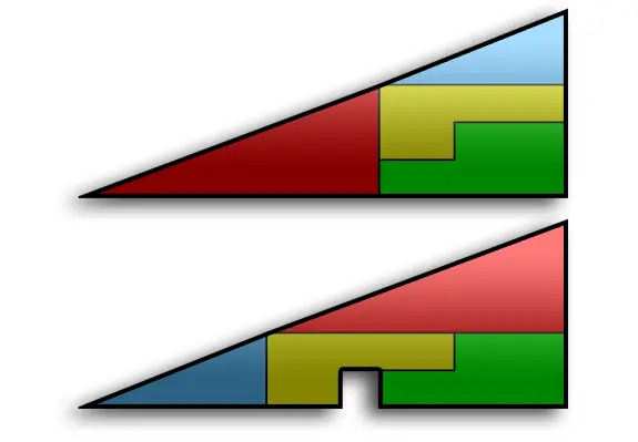 Solución visual | Solution to Missing Square http://jaysdesktop.blogspot.com.es/2009/07/solution-to-missing-square-problem.html