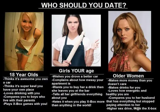 Una realidad que vive todo tipo es tratar de encontrar pareja en un rango de edad que no lo haga sufrir ni sentirse un profanador ni de cunas ni de criptas, pero es algo prácticamente imposible de comprender (al fin y al cabo, hablamos de mujeres), aquí un pequeño cuadro que resume las elecciones posibles: