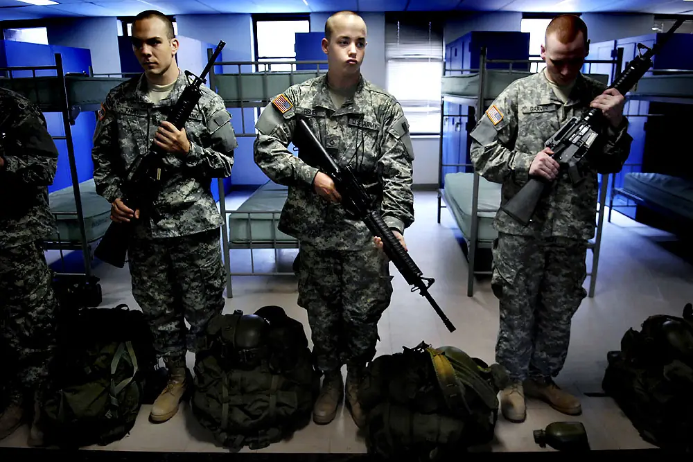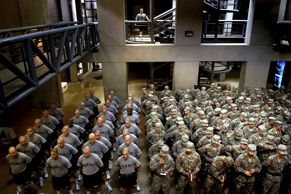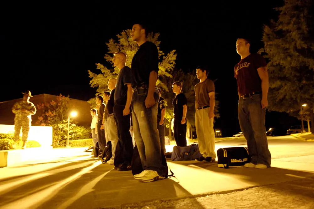 19 de junio de 2007. 12:18 a.m. Llegando a la Fortaleza Benning justo después de la medianoche, los nuevos reclutas alinean en la formación fuera Johnston el Pasillo.El sargento Jackie Etienne les informa sobre todo lo que tienen que hacer esta noche.