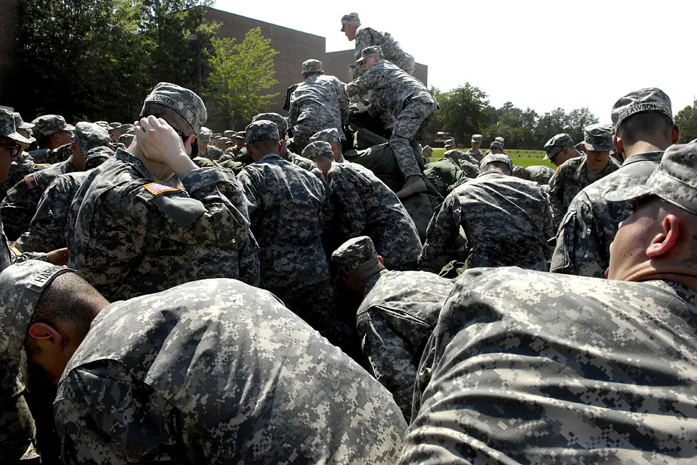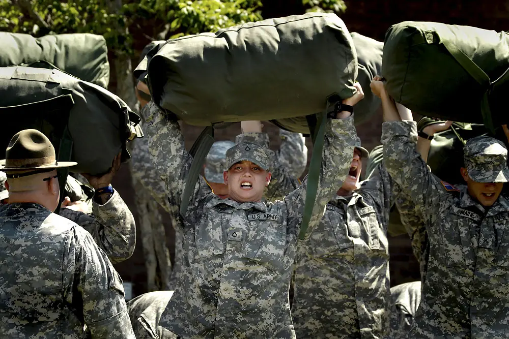22 de junio de 2007. 11:20 a.m. Como ellos no podían completar el ejercicio a tiempo, los nuevos soldados deben sostener sus bolsos encima de sus cabezas como castigo.