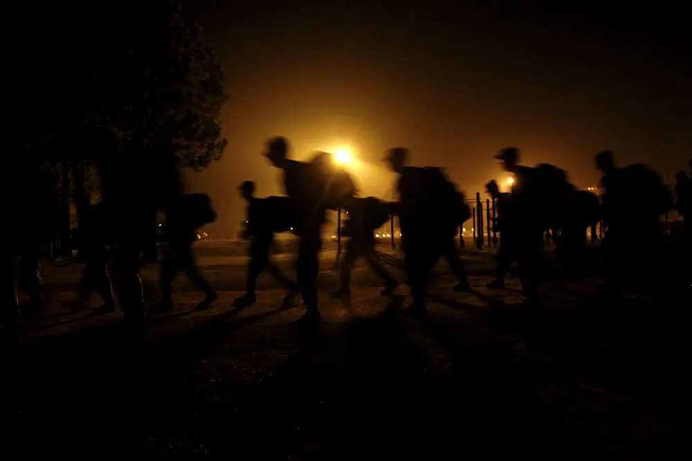 15 de agosto de 2007. 6:05 a.m. El día de las nuevas tropas comienza con una marcha de 5 millas llevando sus mochilas a un combate urbano facil para entrenar en la Fortaleza Benning.