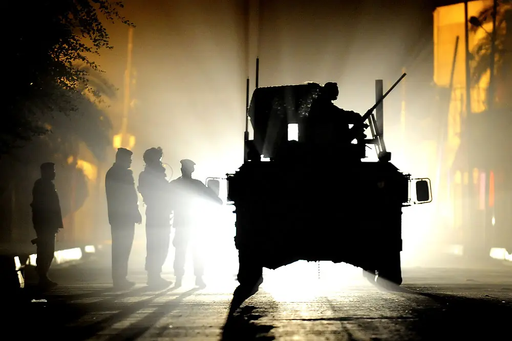 10 de diciembre de 2008. 8:20 de la tarde. Ian, centro, y Buthmann tiran el detalle de seguridad para una reunión entre un equipo de operaciones psicológico y algunos residentes locales que estaban cerca del sitio de un cohete atacan dos noches antes. La reunión es terminada rápidamente; el equipo no encuentra lo que busca.
