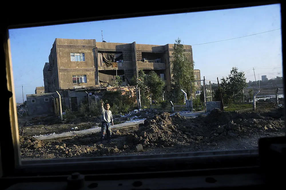 5 de diciembre de 2008. 4:07 p.m.Un muchacho iraquí hace un arma de sus dedos cuando la escuadrilla de Ian pasa. El Sargento de sargento de pelotón la 1a Clase Nathaniel McClain dice a los niños locales a menudo pretende tirar a soldados con armas de juguete. " Ellos no tienen que mirarlo por la TV; es fuera de su puerta de calle, " dice él.