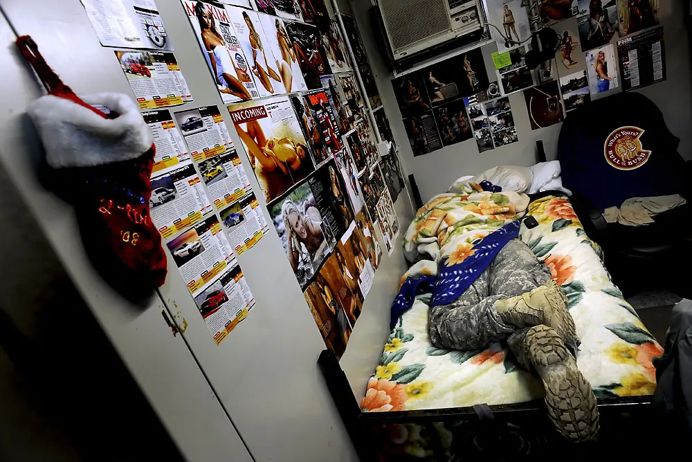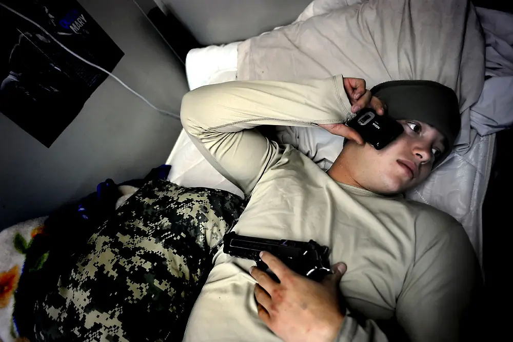 10 de diciembre de 2008. 12:59 p.m. Mientras atrás sobre deberes de Fuerza de Reacción Rápidos, Ian se pone al corriente del sueño totalmente vestido de su engranaje, listo de ir inmediatamente cuando la llamada viene.