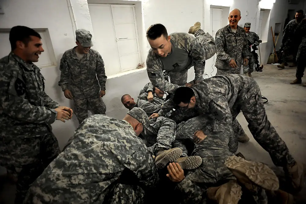 11 de diciembre de 2008. 5:15 p.m. Ian participa en un cumpleaños dogpile encima de la Especificación. David Roper de Leavenworth, Kan. Además de cumpleaños que se divierten, el pelotón recibió los Regalos de Navidad que habían sido enviados por las mujeres de las tropas.