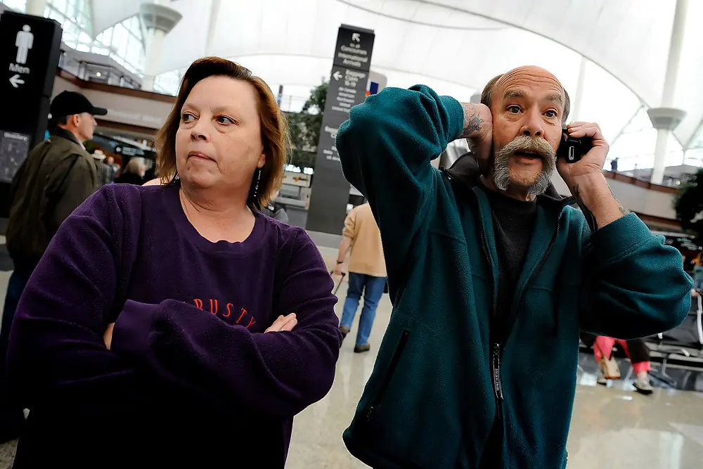 7 de marzo de 2009. 11:28 a.m. Una llamada telefónica de Ian para decir su avión ha llegado consigue a Eric Fisher excitado como la mamá de Ian, Teri Mercill, mira a los pasajeros que llegan.