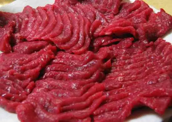 La carne de caballo cruda es un plato muy popular en Japón.Se corta en rodajas finas y se come cruda.Este plato se llama "Basashi".