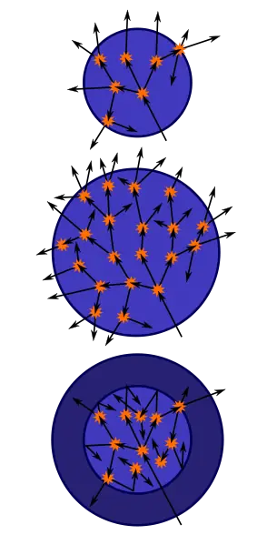 Sin embargo, la reacción en cadena se interrumpe rápidamente si no hay bastante material alrededor. Esto se debe al sencillo hecho de que los átomos de la materia están enormemente separados entre sí –la inmensa mayoría de lo que ven tus ojos y tocan tus manos es espacio vacío, aunque no lo parezca–. Por ello, la mayor parte de los neutrones que surgen en estas fisiones espontáneas no llegan a alcanzar otros núcleos fisibles y se pierden hacia el exterior en forma de radiación neutrónica. Es preciso acumular una cierta cantidad de material para que haya muchos núcleos fisibles por todas partes, la probabilidad de que los neutrones alcancen alguno de ellos aumente y la reacción se mantenga a sí misma.