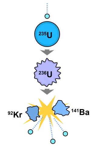 ¿Qué es lo que hace que un núcleo fisione, es decir, se rompa? No gran cosa. Ocurre constantemente en la naturaleza, por simple probabilidad cuántica o cualquier estímulo exterior. Los núcleos grandes e inestables tienden a romperse y, según una determinada probabilidad, lo hacen a todas horas. Por ejemplo, la mayor parte del uranio existente en la naturaleza ha fisionado ya a lo largo de los últimos miles de millones de años, y por eso es tan raro en la actualidad. Esto se llama fisión espontánea, y va ocurriendo a su ritmo. En la imagen de la derecha, un núcleo de uranio-235 absorbe un neutrón, se convierte en uranio-236 altamente inestable y fisiona en dos elementos nuevos, kriptón-92 y bario-141 (sí, como en la transmutación de los alquimistas). Al hacerlo, libera varios neutrones más y una cantidad importante de energía en forma de radiación.