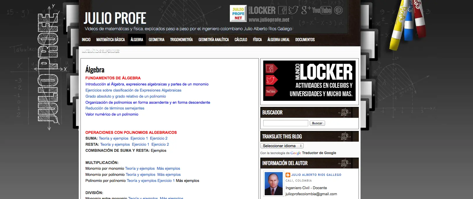 Julio Alberto Ríos es un aclamado y galardonado profesor colombiano famoso por sus sencillas explicaciones de variados temas de Álgebra, Cálculo, Trigonometría, Física, Matemáticas básicas y otras ciencias similares. Sus puntos fuertes son su caligrafía, su paciencia para explicar paso por paso cada tema, su claro lenguaje, sus consejos y sus trucos (por ejemplo, para recordar la fórmula de integración por partes). En su sitio web hay incluso material de estudio en PDF.