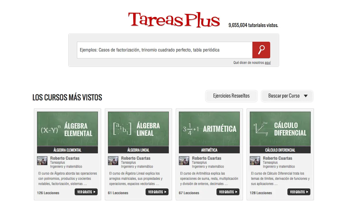 En Tareasplus se ofrecen cientos de videotutoriales de Matemáticas, Física y Química. En el primer grupo destacan materias específicas como Aritmética, Cálculo (Diferencial e Integral), Probabilidad y Estadística, Ecuaciones diferenciales, Álgebra y hasta un espacio para las curiosidades matemáticas, todas con material explicativo y ejercicios resueltos y explicados fácilmente. Es más agradable ver los videos desde su sitio web pues están mejor organizados y está disponible un buscador. Por cierto, viene también en forma de aplicaciones para iPhone, iPad y Android.