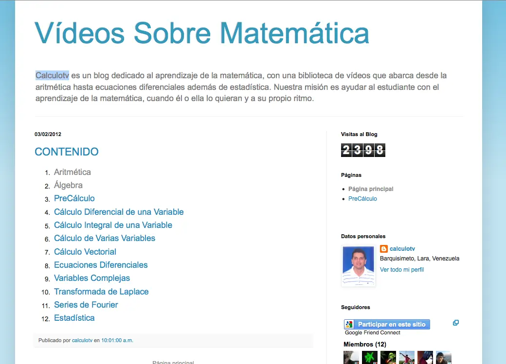 Calculotv es un blog dedicado al aprendizaje de la matemática, con una biblioteca de vídeos que abarca desde la aritmética hasta ecuaciones diferenciales además de estadística. Nuestra misión es ayudar al estudiante con el aprendizaje de la matemática, cuando él o ella lo quieran y a su propio ritmo.