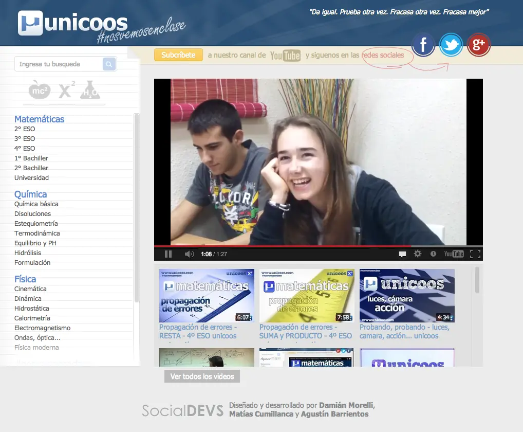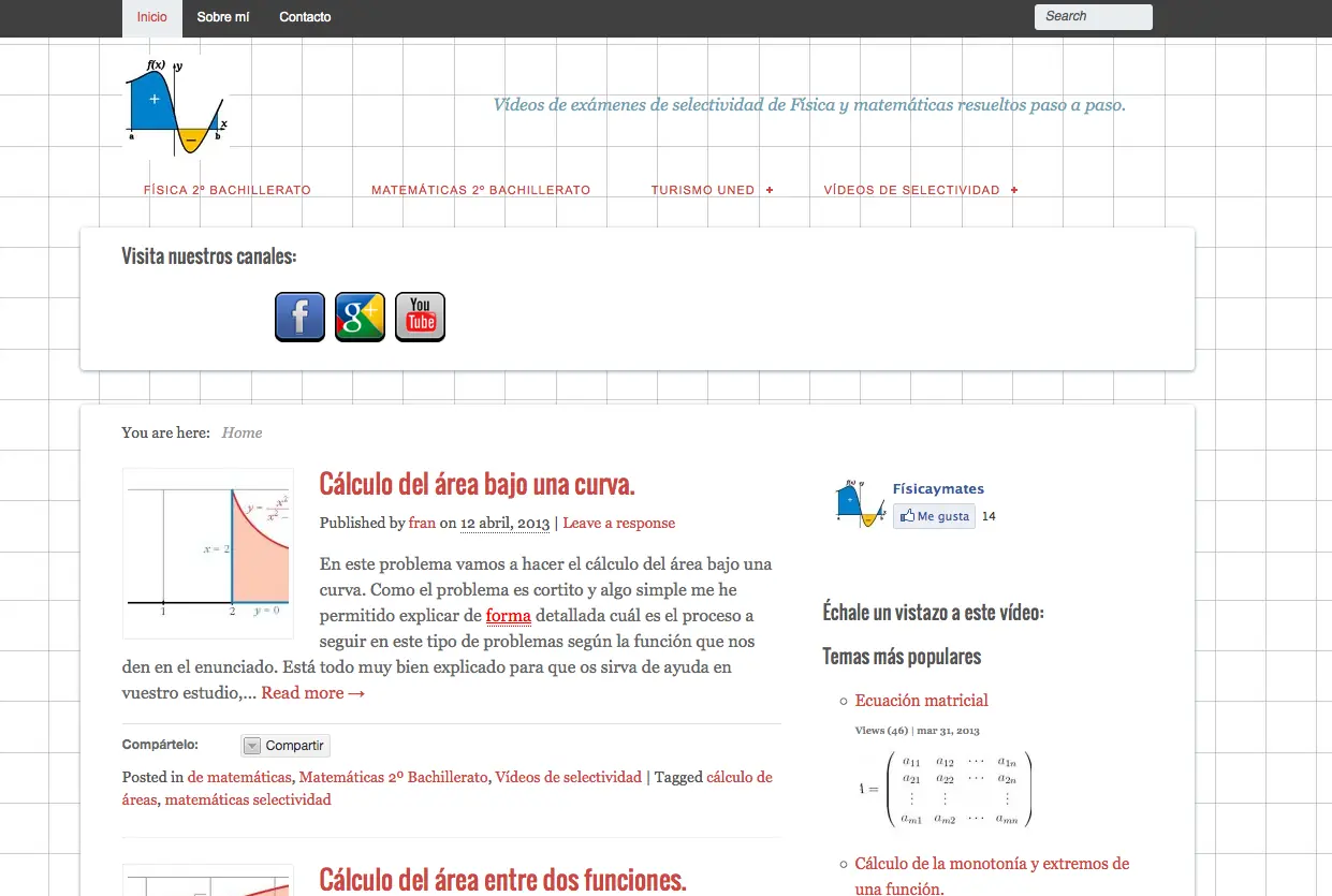 Físicaymates, al igual que el canal de Ever Salazar, lo conocimos en la comunidad de Cursos Online Gratuitos que gestionamos en Google+. El responsable del sitio comparte sus excelentes explicaciones en video enfocadas a resolver “dudas de Matemáticas y Física de bachillerato, Selectividad (examen español) y primeros cursos universitarios”. Vale destacar el útil material que podremos encontrar específicamente sobre temas de Cálculo Diferencial, Cálculo Integral y Estadística.