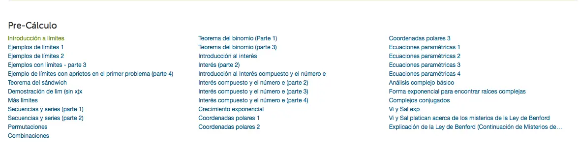 Una de las plataforma pioneras respecto a cursos masivos y gratuitos en línea fue Khan Academy, un espacio donde profesionales de diversas áreas y de diferentes partes del mundo compartían sus amplios conocimientos a través de videos cortos y con claras explicaciones. Aunque su versión en español no ha evolucionado tan rápido como su elegante versión original en inglés, ya se ha traducido y adaptado bastante material al español gracias a profesionales de habla hispana.