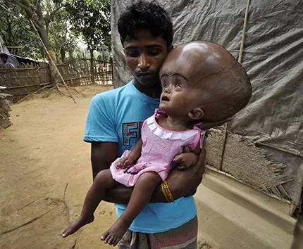 A Roona Begum, de 18 meses, le fue diagnosticada al poco de nacer un tipo de hidrocefalia que acumula líquido cefalorraquídeo en el cerebro. La enfermedad, potencialmente mortal, ha hinchado terriblemente su cabeza, cuya circunferencia mide ya 91 centímetros, ejerciendo presión sobre el cerebro.