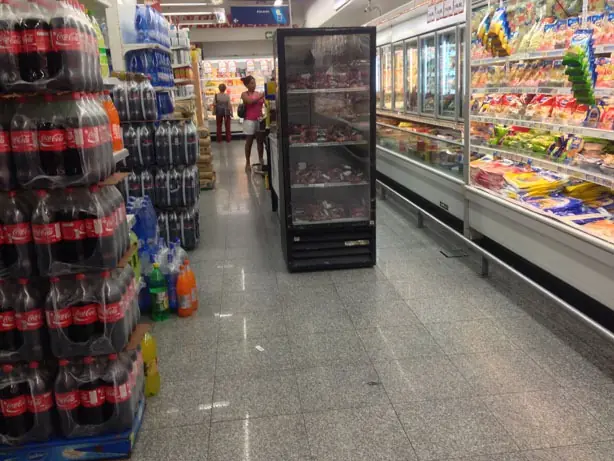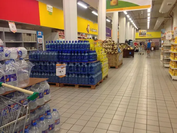 Pasillos angostos. En ningún caso la separación entre las góndolas (como podemos ver debajo) permiten que circulen más de tres carros al mismo tiempo uno al lado del otro. Por lo general entran dos, y muchas veces se colocan pallets, cajas, botellas u otros objetos que obstaculizan el paso y hacen que debamos detenernos… y tentarnos, como se puede ver en la segunda imagen.