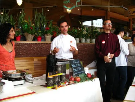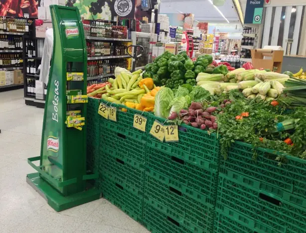 Otro de los recursos más utilizados es el de intercalar productos relacionados con lo que se está exhibiendo (algo así como productos “contextuales”). Por ejemplo, un dispositivo para cortar pizzas junto a la heladera de los congelados. Como vemos , vasos descartables en el sector de las bebidas o un display con caldos entre las verduras.