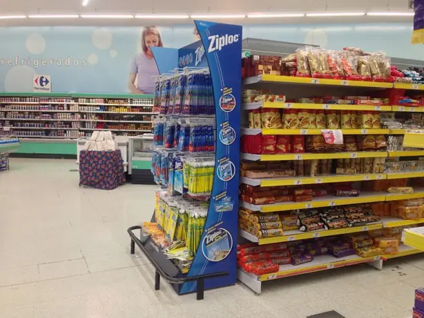 Otro de los clásicos son las ubicaciones “premium” como lo son las llamadas “puntas de góndola”, que por lo general destacan algún producto que ya se vio en el pasillo, con lo cual se repite un mismo elemento, pero en un espacio privilegiado. También se puede ubicar un display especial, como vemos debajo.