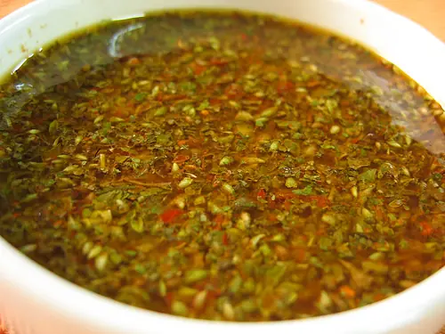 *4ª opción) Picar 2 tazas de perejil, 8 dientes de ajo, 4 hojas de albaca y 1 cucharada de pimentón dulce. Agregar ½ taza de aceite de oliva, 2 cucharadas de limón, 2 cucharadas de vinagre de manzana y 2 cucharadas de vinagre balsámico. Luego agregar la sal y la pimienta. Rectificar y corregir con sal y pimienta si fuera necesario.