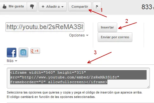Si queremos insertar un video en el blog del aula pero deseamos que se inicie en un punto determinado, debemos añadir &start=número de segundos que queremos saltar del inicio, dentro del código de inserción que nos proporciona YouTube. Podemos encontrar el código siguiendo los pasos de la imagen: