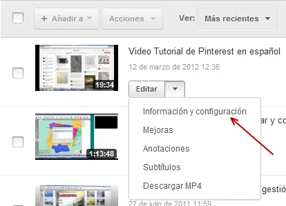 Para configurar que los videos sean sin clasificar o privados, debemos entrar en nuestra cuenta de YouTube y escoger Gestor de videos. Allí encontraremos la lista de videos que hemos subido. Abrimos Editar como en la foto de abajo y escogemos Información y configuración.
