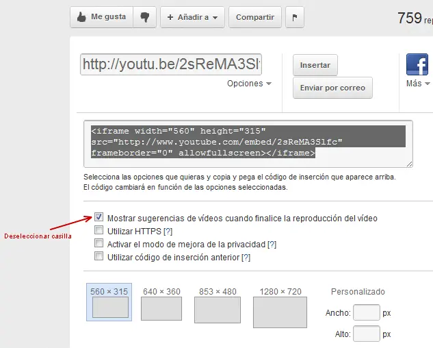 Para ello simplemente se desmarca la casilla “Mostrar sugerencias de vídeos cuando finalice la reproducción del video“, que se encuentra debajo del código de inserción. Ahora se copia y pega el código de inserción que aparece arriba. El código cambia en función de las opción que hayamos seleccionado.