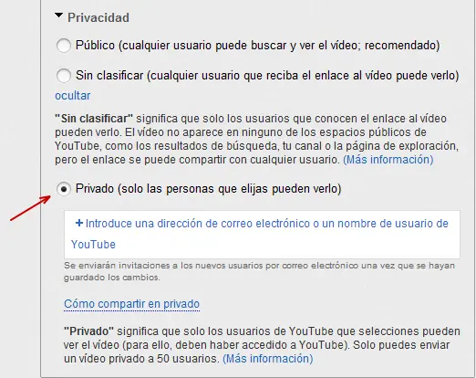 “Privado” significa que sólo las personas que seleccionemos, pueden ver el vídeo. Para ello, deben tener una cuenta en YouTube y entrar en ella para visualizar el video. Sólo podemos enviar un vídeo privado a 50 usuarios como máximo. Podemos invitarles a través de su correo electrónico o su nombre de usuario en YouTube.