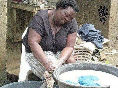 Después de terminar la limpieza de las manos de su madre, el joven lavó toda la ropa restante.