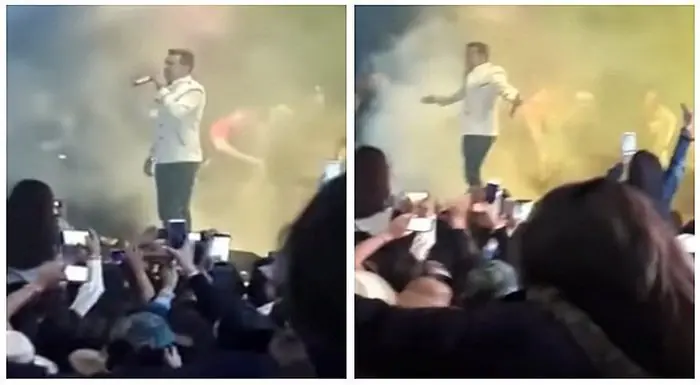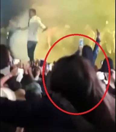 , aparece de espaldas una mujer que se confunde con los seguidores que se encuentran en el show, mientras el cantante emocionado grita a su público, la chica que llevaba una chaqueta puesta gira y muestra su rostro ‘endemoniado’.