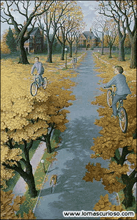 Atención: No mires esta ilusión si te afectan las imágenes parpadeantes. ¿El siguiente círculo gira en el sentido contrario a las agujas del reloj (hacia la izquierda)? Si mantienes tu vista fija y sin parpadear en el punto central durante unos segundos, llegará un momento en que parece que se produce un cambio de giro en sentido contrario (hacia la derecha) y más lento. Si dejas de mirar el punto verás que el giro vuelve a ser hacia la izquierda y más rápido. La imagen es siempre la misma, no cambia. En realidad no es que gire a un lado u otro sino que alterna los colores entre el rojo y el blanco, lo que nos provoca una sensación de movimiento.